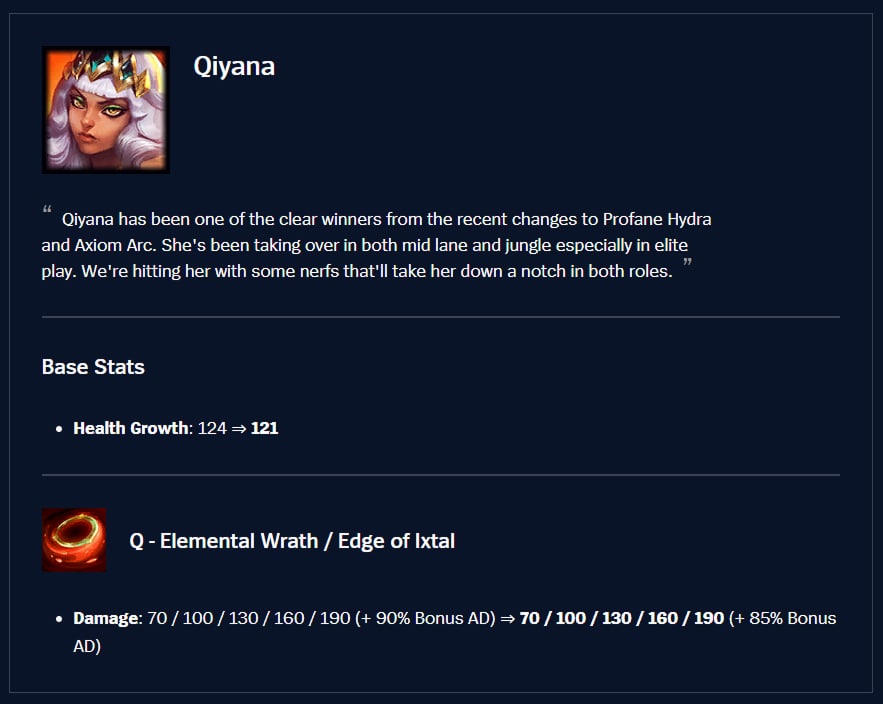 Qiyana requires a fair bit of skill, though she struggles a bit when she can’t burst down a target. We want to adjust some of her tools for extended fights, that should still let her take down a squishy target, while helping her hold her own against a more durable target.