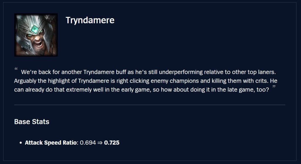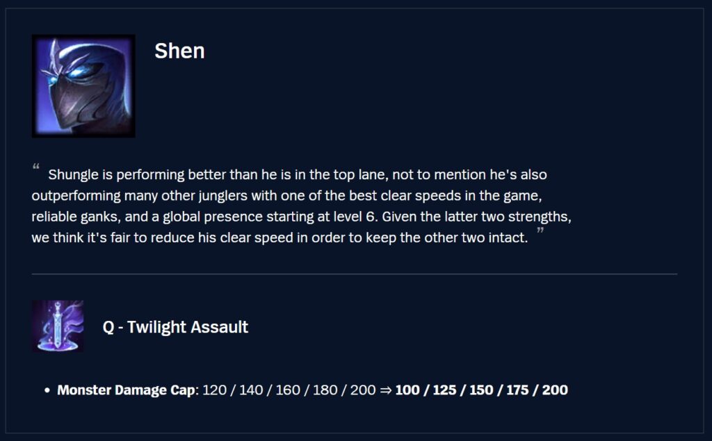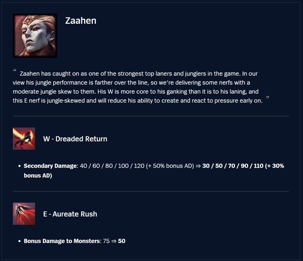 We’re really happy to see Zaahen picking up a sizeable audience in both Top and Jungle, but now that regular players, in addition to experienced players are starting to demonstrate that top end mastery performance, he’s looking too strong across the board. Currently, we think his Jungle is a bit stronger than Top, so the nerfs are mostly focused there