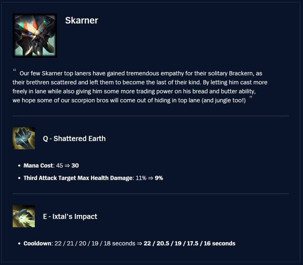 Skarner has been out of the spotlight for a while and since we’ve tapped down a few of the things that were causing him to be overbearing in Top (especially W max and the E point blank kidnaps), we think he can get a bit more power there