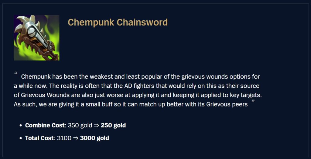 Chempunk Chainsword has been one of the weaker Grievous items for a while. While we don’t want Grievous items to become too commonplace, as it subtly degrades champion kits when too common, it is still just a bit weak for even that purpose