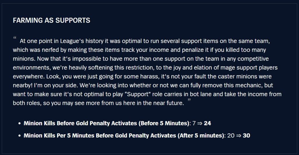 The support item minion penalty has been a pain point for support users, and with role quests, the risk of funnelling (why it was there in the first place) has been reduced pretty significantly, so we’re removing that drawback
