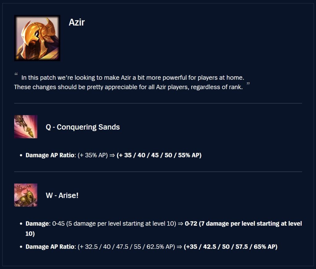 We’re buffing Azir to distribute some of his power back into regular play capabilities through scaling power that Azir players hopefully will appreciate