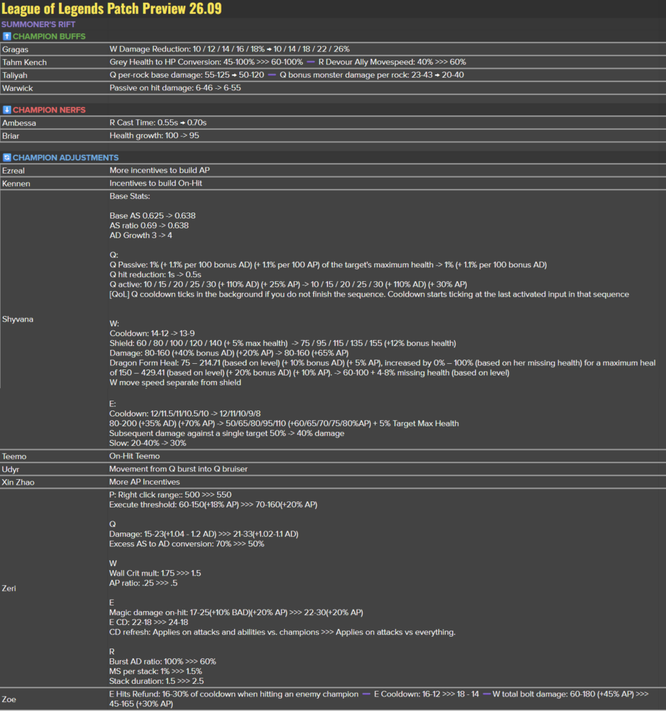 The 26.9 patch preview for League of Legends is out. It’s a bigger patch this time around, as the game prepares for Season 2. While only six champions are being directly buffed or nerfed, there are lots of changes to other champions, systems, and much more. From @RiotPhroxon on X Source